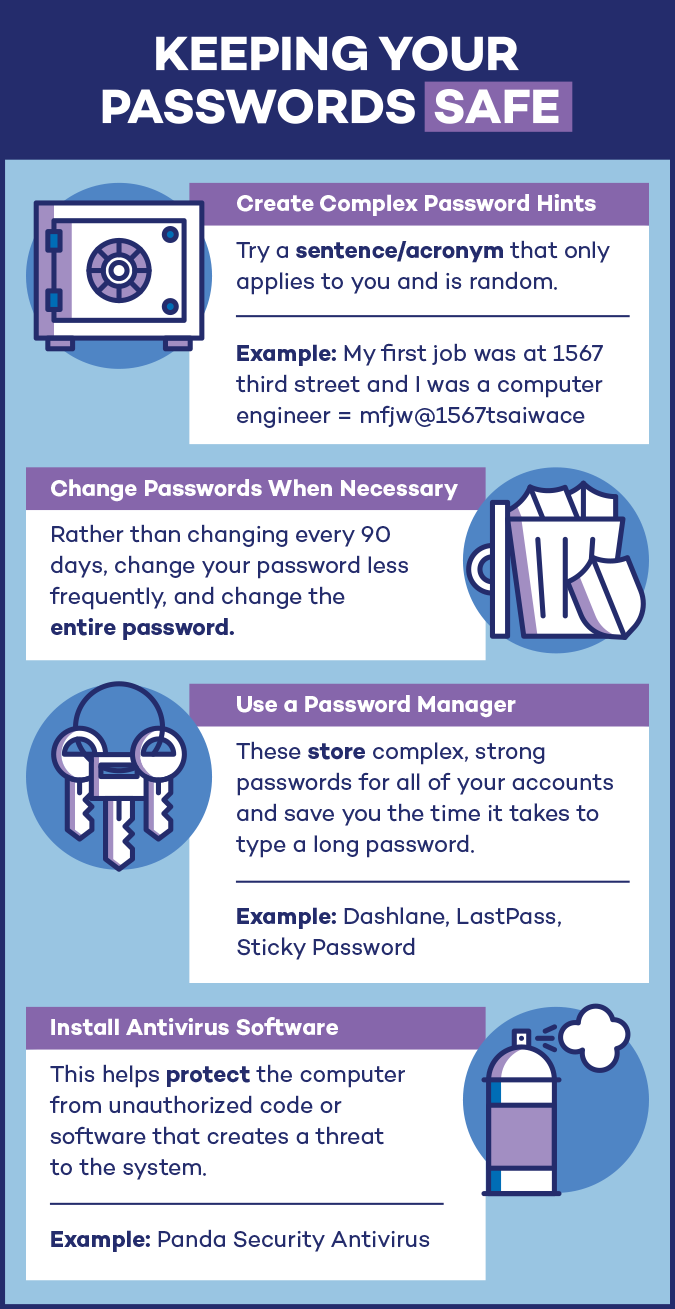 In order to keep your passwords locked and secure, it’s important to create quality passwords and use security measures when creating new accounts. While many studies used to say to change your password every 90 days, the newest guidelines actually suggest changing your passwords when necessary, as changing too often can actually hurt you rather than help you.