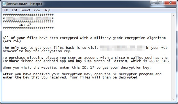 The ransomware is employed using an AES-256 encryption algorithm and appends the files with the .se extension. As can be seen below, the ransom note demands $100 worth of Bitcoin (0.18 BTC).