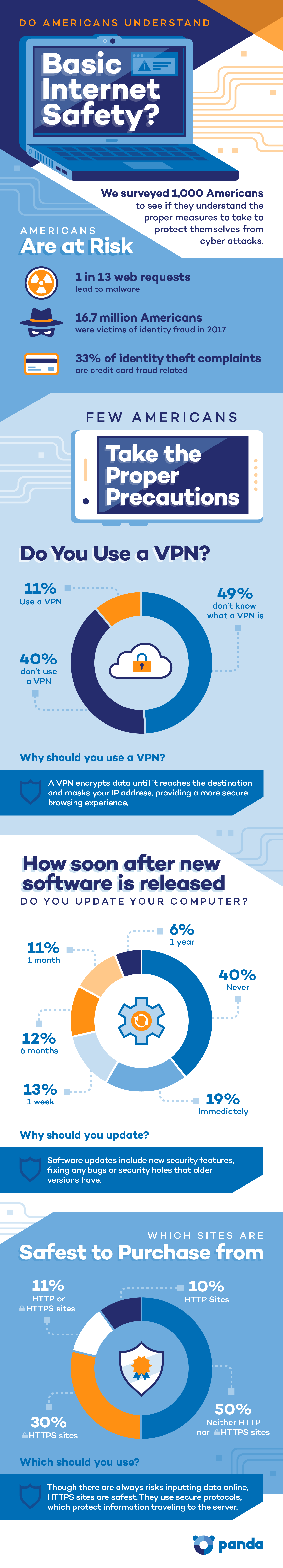 40% of Americans said they never update their computer after new software is released. It takes 23% of participants at least a month to update their software. Updating software is crucial, as holes in software and outdated antiviruses can leave you vulnerable.