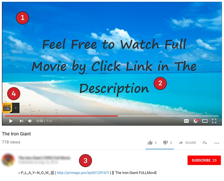 The image below shows a suspicious result from searching for “The Iron Giant Full Movie”. These four warning signs scream “Stay away!”: