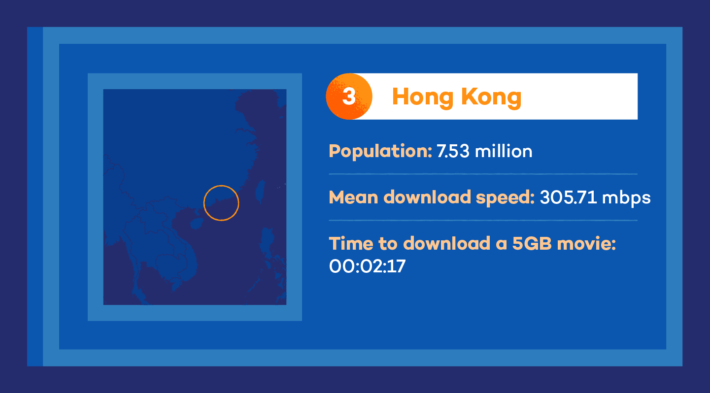 Hong Kong secures the third spot in 2025 with an average internet speed of 312.60 Mbps. This high-speed connectivity is a result of Hong Kong’s strong focus on maintaining advanced digital infrastructure. For residents, this means seamless streaming, fast downloads and a reliable online experience, making Hong Kong one of the best places for high-speed internet access.