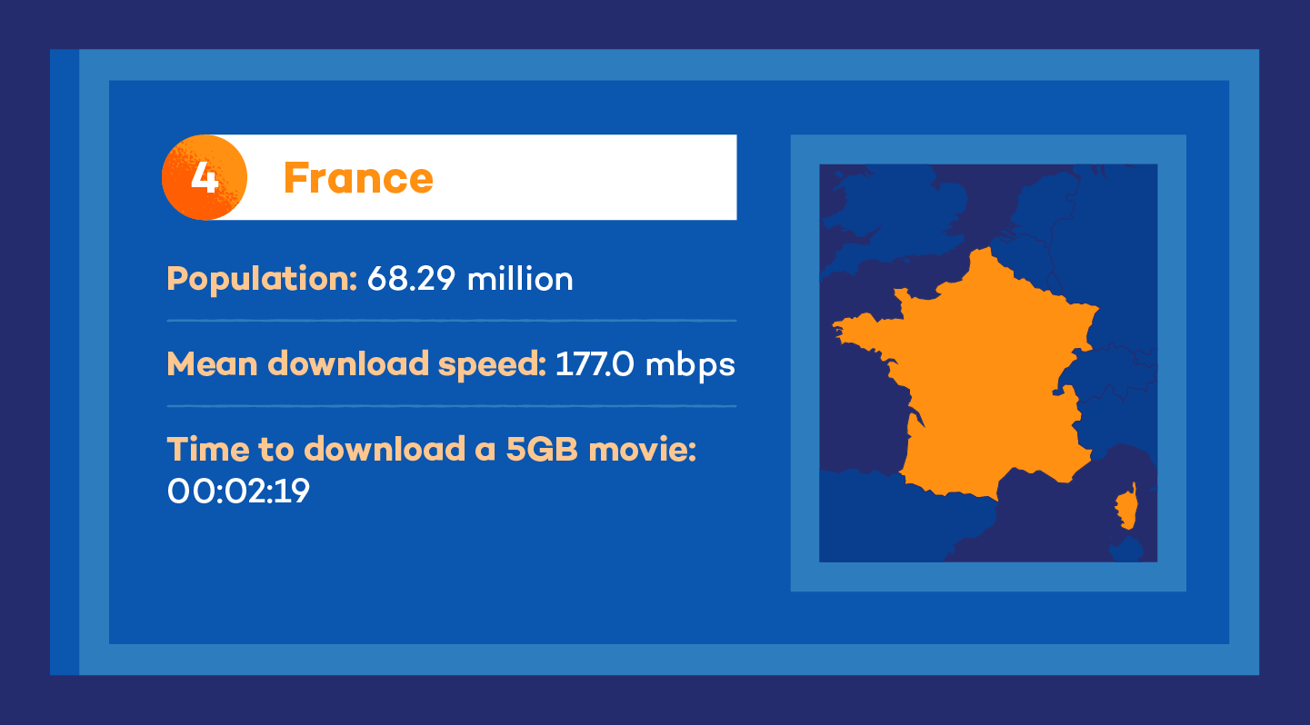France ranks fourth globally with an average download speed of 308.01 Mbps. The country has made significant investments in fiber optic networks, expanding coverage across both urban and rural areas.