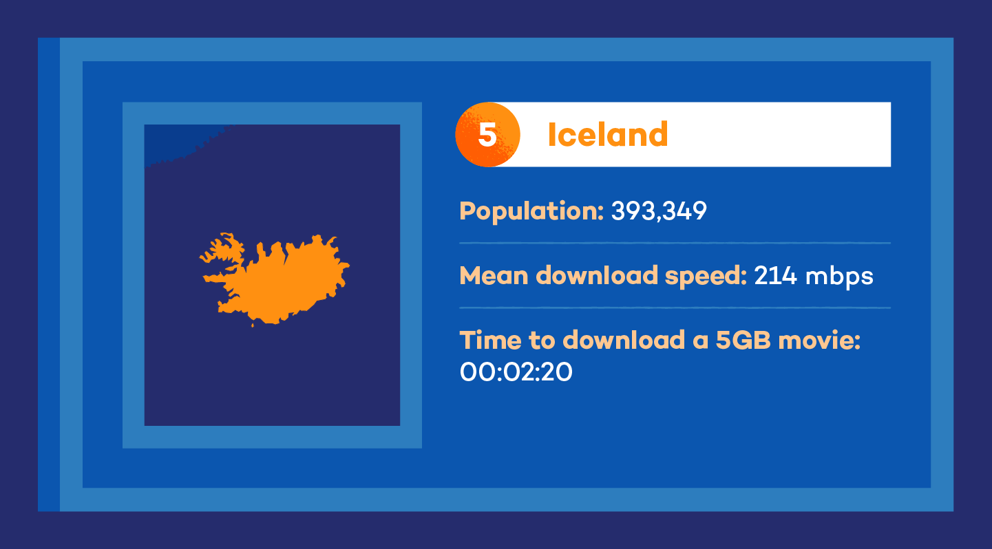 Despite its remote location, Iceland ranks fifth globally with an average download speed of 306.22 Mbps. This high-speed connectivity is attributed to several factors, including substantial investments in fiber optic infrastructure, a relatively small and technologically advanced population and a competitive market among internet service providers.