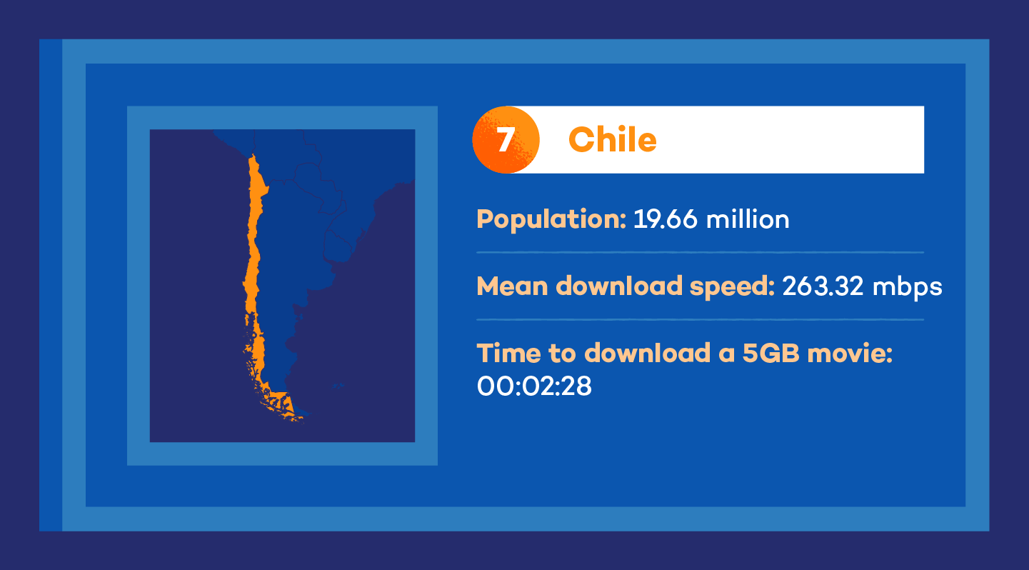 Chile ranks seventh with an average internet speed of 263.32 Mbps. With such high speeds, users in Chile enjoy faster browsing, smooth streaming and efficient online activities, making it the top country for high-speed internet in Latin America.