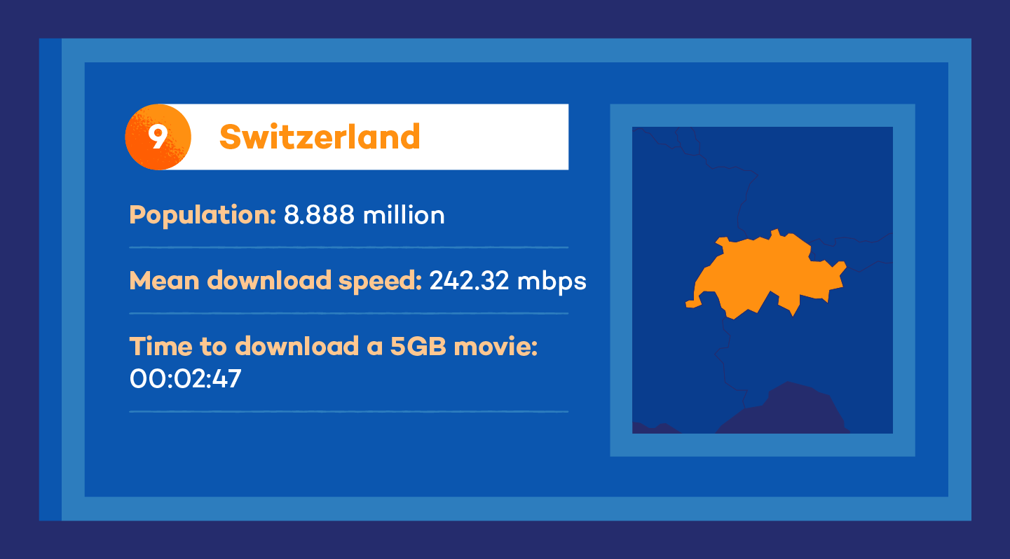 Switzerland ranks ninth in 2025 with an average internet speed of 256.91 Mbps. Known for its precision and efficiency, the country brings the same level of excellence to its digital infrastructure. Whether you’re working remotely from the Alps or streaming in the heart of Zurich, Swiss users benefit from fast, stable and high-quality internet that keeps them seamlessly connected.