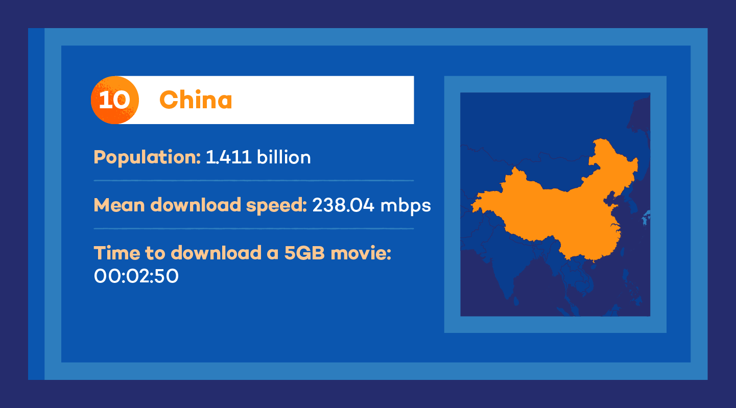 China comes in at 10th place with an average internet speed of 252.45 Mbps. Backed by massive investments in digital infrastructure and 5G rollout, the country continues to push the envelope on connectivity. From bustling cities like Shanghai and Beijing to smaller tech-driven hubs, users across China enjoy high-speed internet that supports everything from HD streaming to advanced cloud applications.